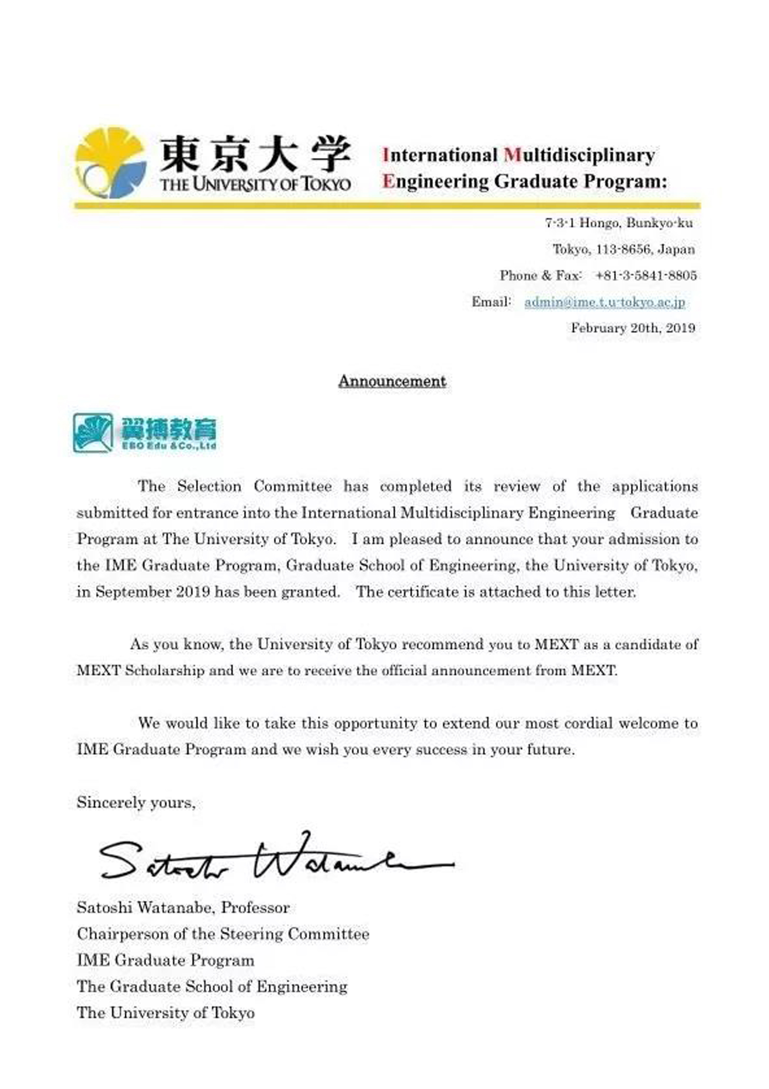 東京大學工學院修士課程(IME材料免試錄取,MEXT獎學金獲得者);